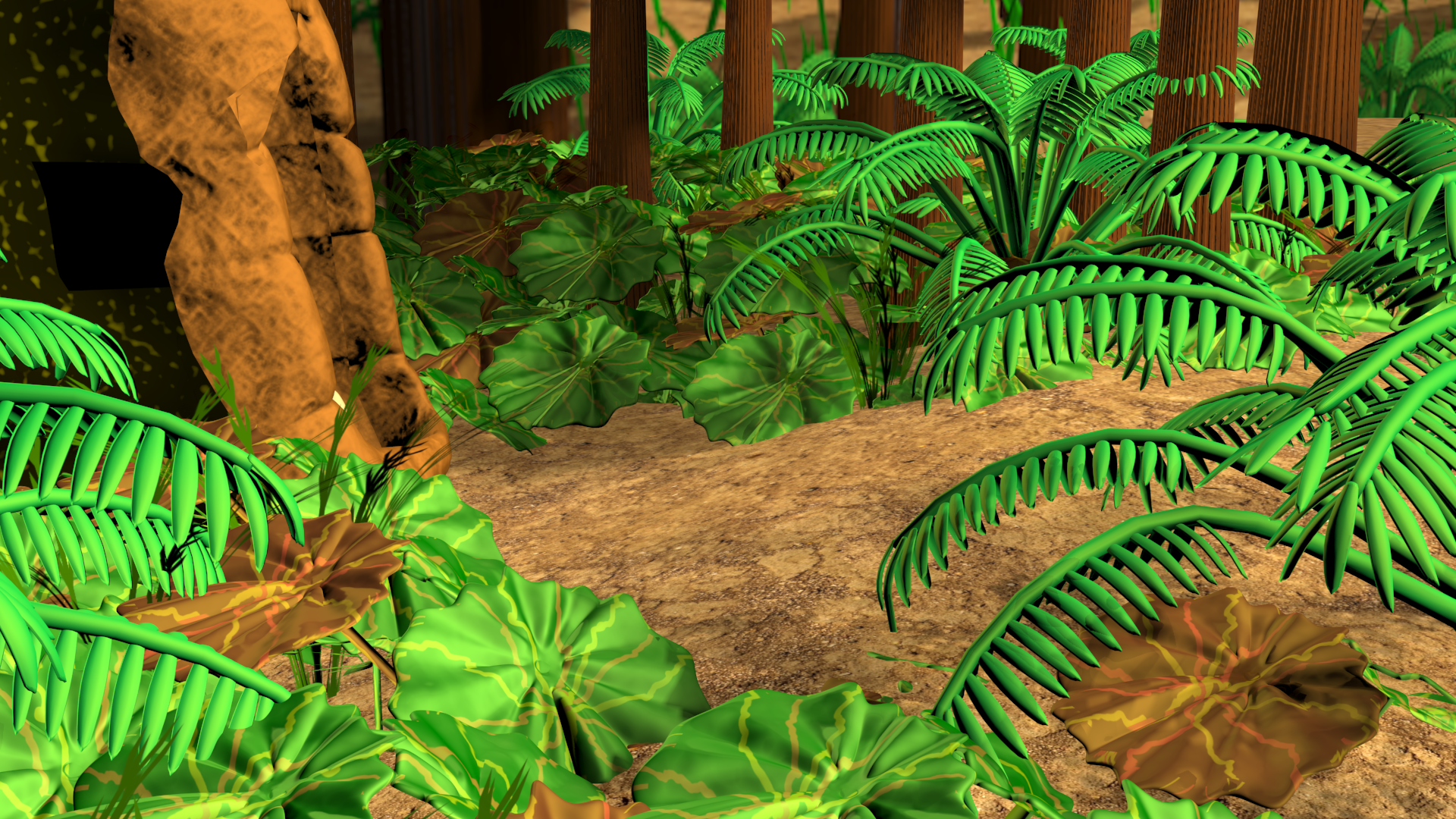 Here is a render with added textures to the ferns. They are a little darker now. should I increase the greenness of the ferns and make them brighter?