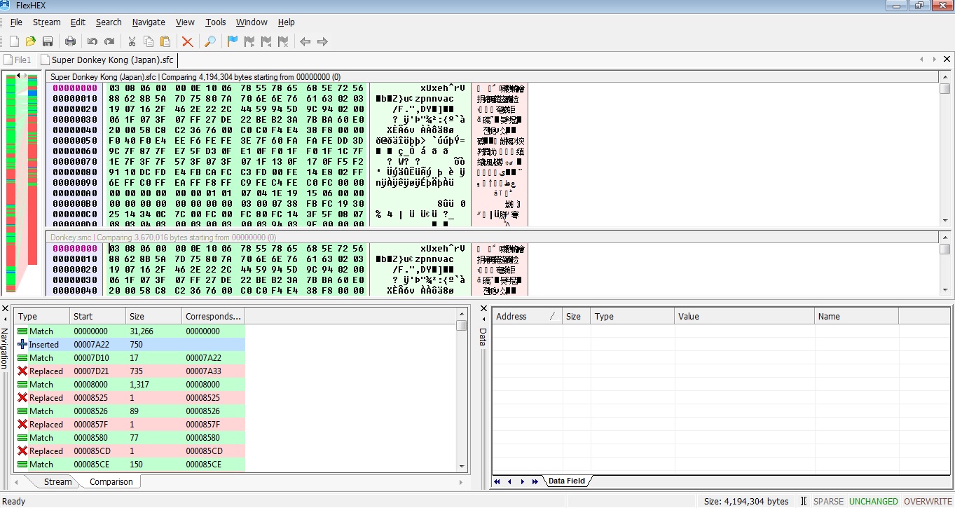 Kingizor wrote:Even if the ROM is different the size should be the same. "Donkey.smc" is only 3,670,016 bytes compared to the correct size of 4,194,304 (4MB), so it seems like you're missing some data. If the ROM tries to load code or data from a high region and can't find what it needs it would almost definitely end up not working.