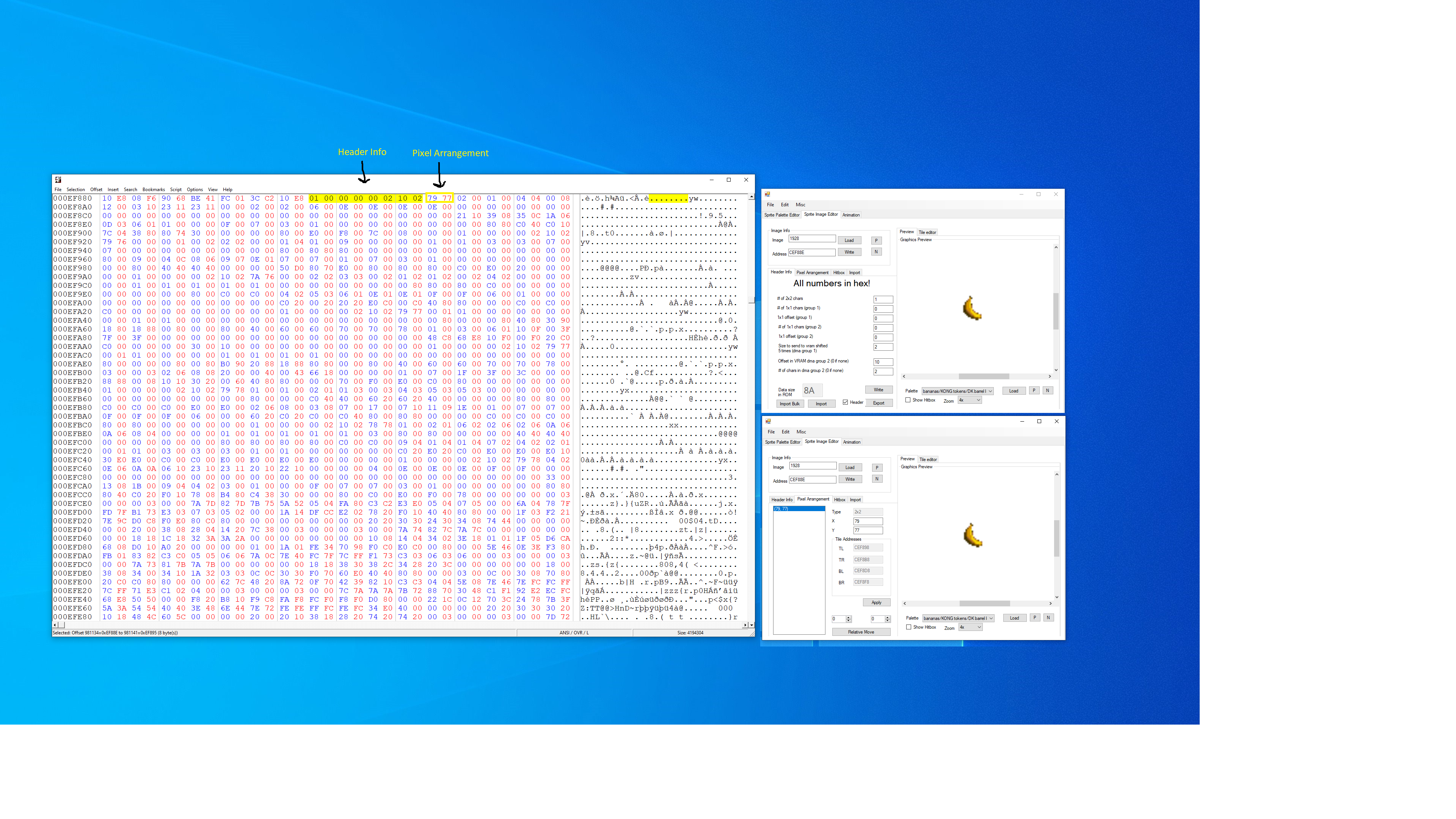 Cyclone wrote:Right now I’m just trying to understand how to read the gfx data and nothing else. I think I found where the first frame of the banana sprite is stored. Now I just need to understand how to read the data in the hex editor.